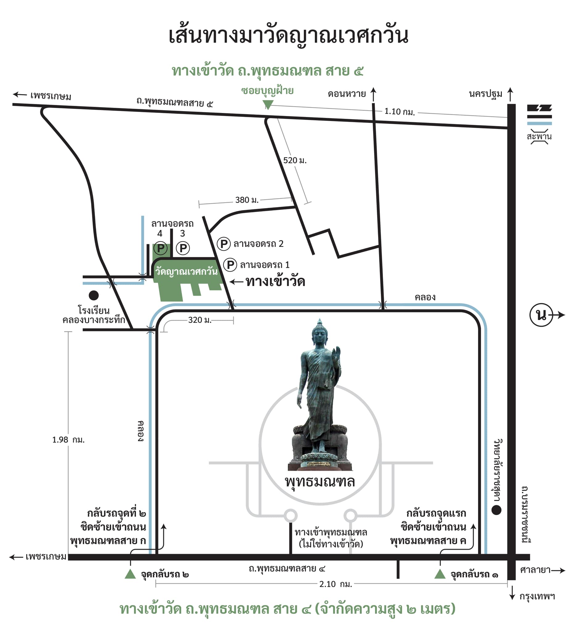 สำหรับผู้ที่เดินทางมาจากถนนพุทธมณฑลสาย ๔ หากจะใช้เส้นทางถนนรอบพุทธมณฑล (พุทธมณฑล ก - ค) จะจำกัดความสูงของรถที่สัญจรได้ไม่เกิน ๒ เมตร (หากรถสูงเกินจากที่กำหนด กรุณาเลี่ยงไปใช้เส้นทางพุทธมณฑลสาย ๕ แล้วเข้าซอยบุญฝ้าย)